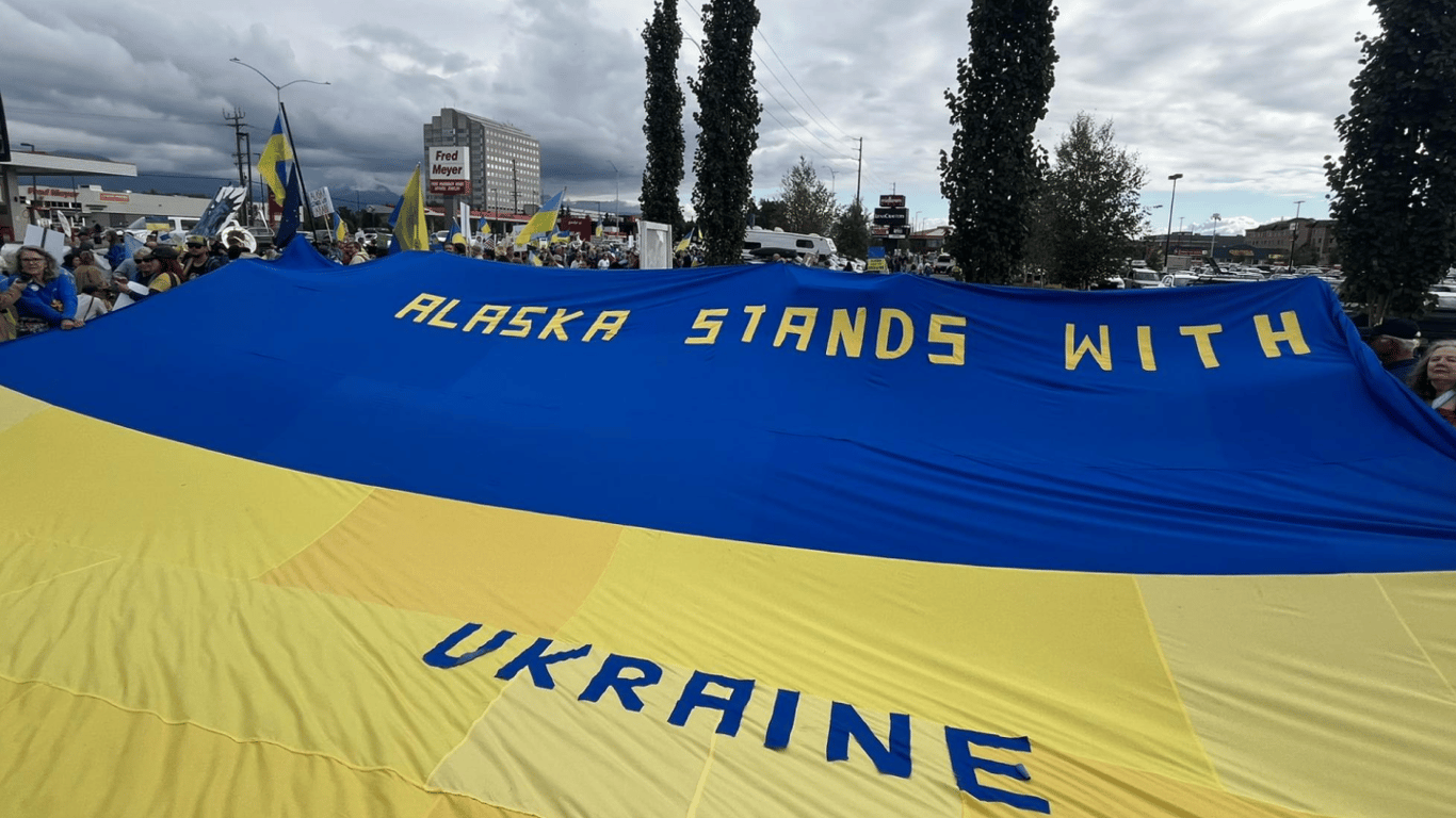 В Анкориджі, найбільшому місті Аляски, проходить масштабний мітинг на підтримку України напередодні зустрічі президента США Дональда Трампа з російським лідером Володимиром Путіним. Учасники акції скандують гасла проти російської агресії та розгортають жовто-блакитний прапор, демонструючи солідарність з українським народом.