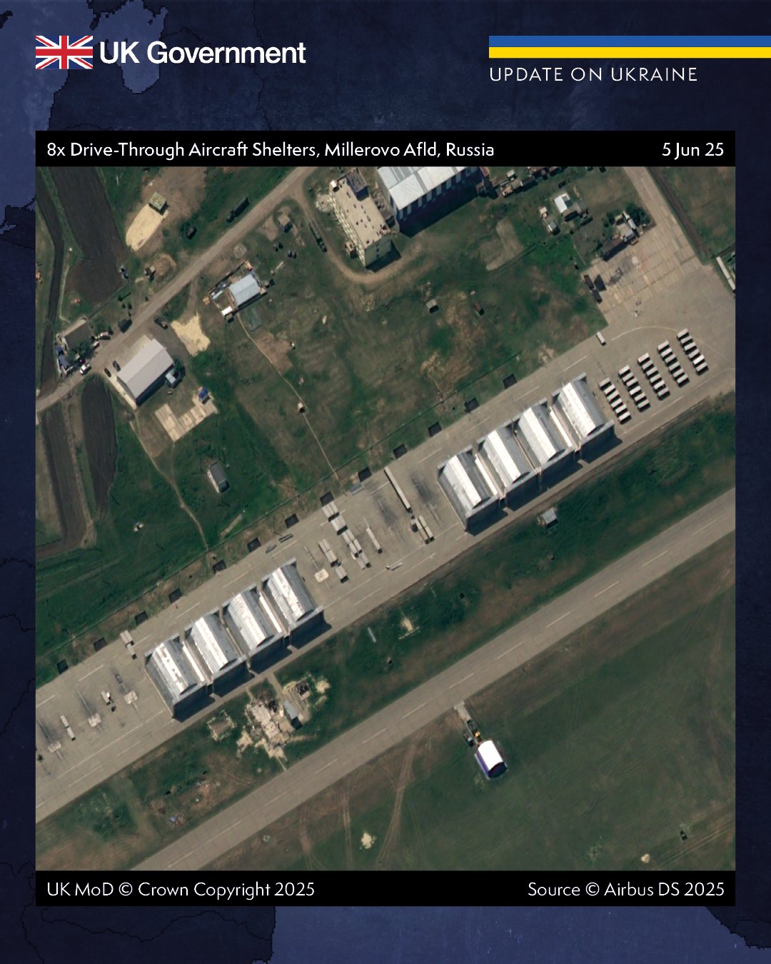 Британська розвідка повідомляє, що у відповідь на удари українських дронів Росія розпочала реалізацію програми щодо захисту своїх вразливих літаків. Захисні заходи впроваджуються на кількох аеродромах, розташованих поблизу кордону з Україною.