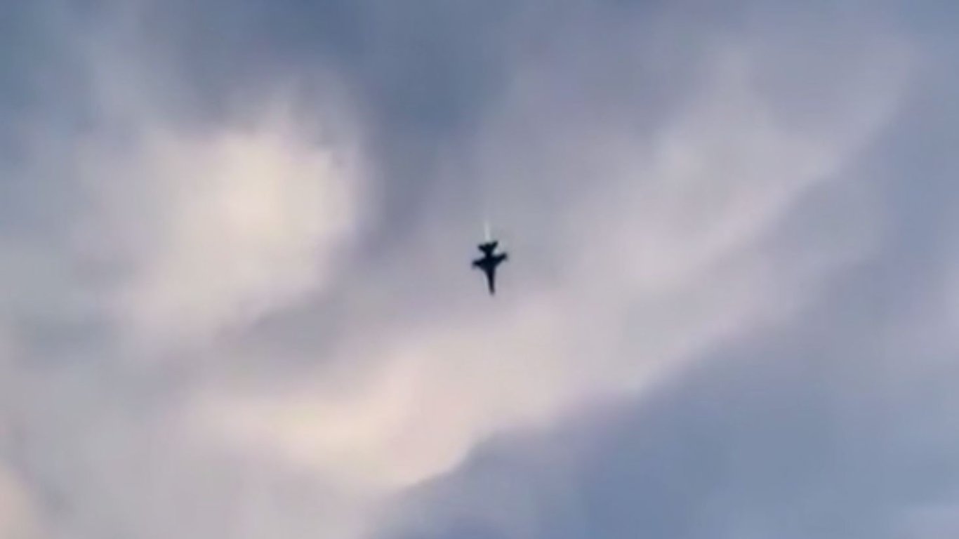 На видео зафиксирован момент, когда истребитель резко пошел вниз и врезался в землю.