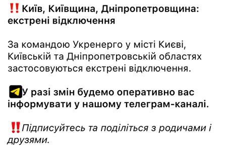 "Першочергово — відключаються промислові споживачі та бізнес. Графіки обмеження потужності для промисловості — продовжують діяти", — йдеться у повідомленні.