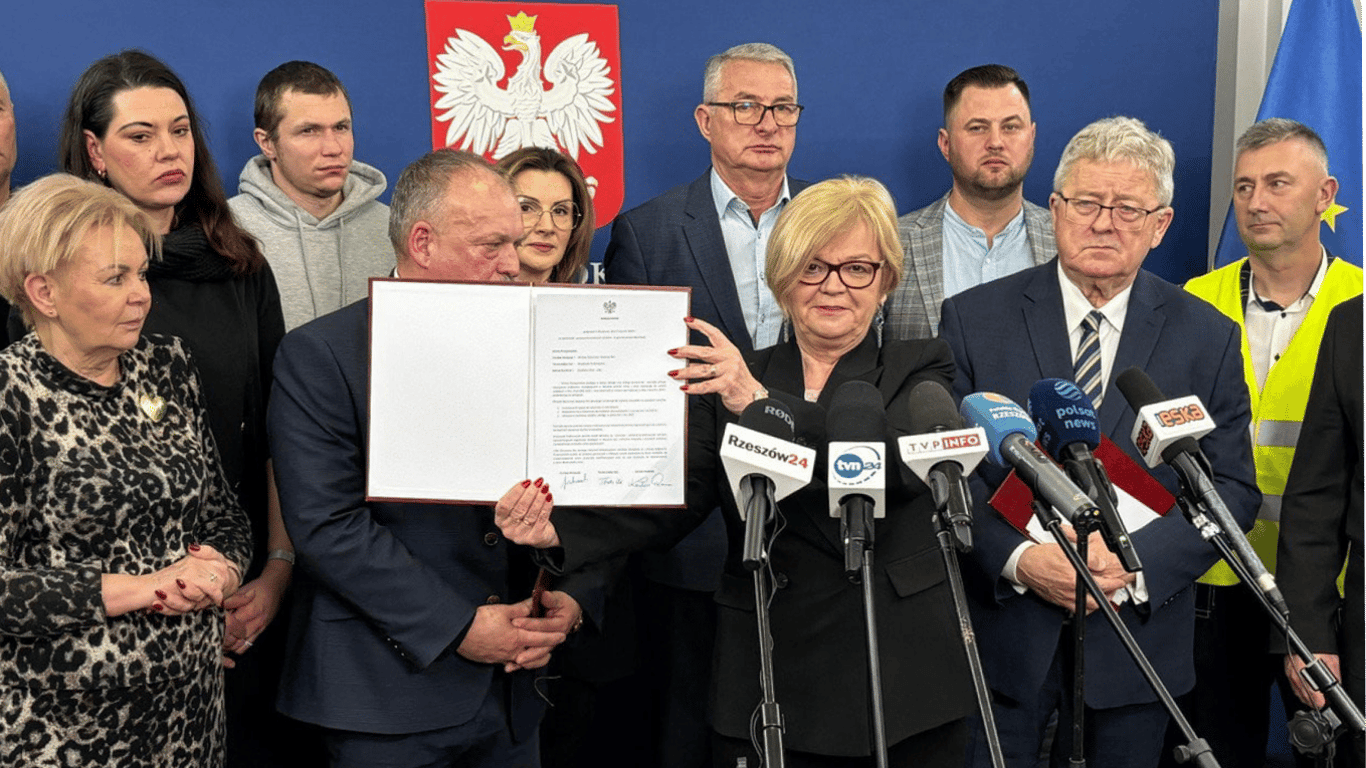 Воєвода Підкарпатського воєводства Тереза Кубас-Гуль та міністр сільського господарства Польщі Чеслав Сєкєрський підписали угоду про зняття блокади з протестувальниками з організації "Підкарпатське ошукане село".