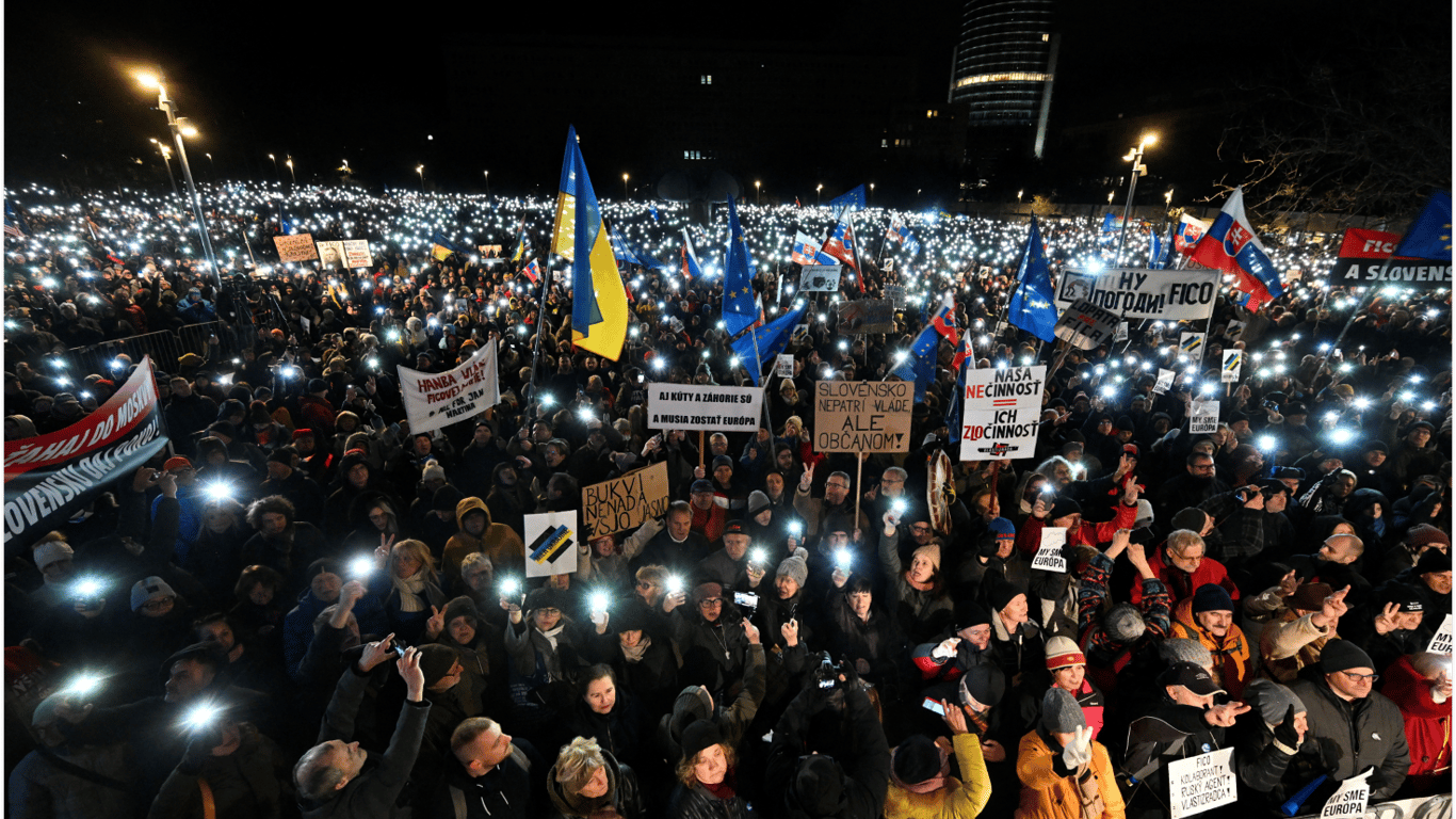 Також 3 січня у Братиславі уже був мітинг проти Фіцо. Люди вимагали європейський курс країни та висловлювали невдоволення через можливий вплив Росії.